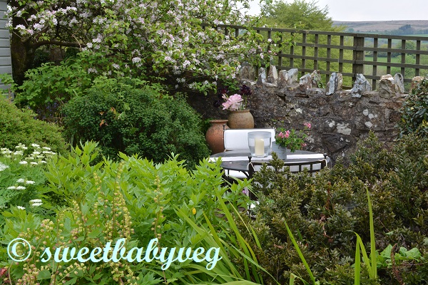 Published May 21, 2014 at 600 × 400 in Cottage Garden Sweet Rocket & Daisies… A little place to sit, protected from the wind by the granite wall on one side and by Butchers Broom and Lovage on the other.