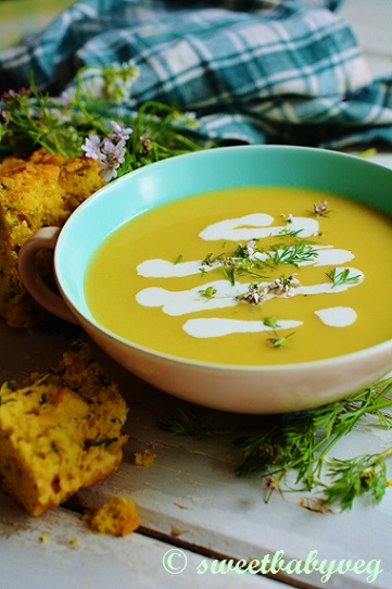 • When you are ready to serve the soup, heat, then swirl with crème fraiche and scatter with fresh coriander leaves. Lovely with crusty bread and butter or cornbread.