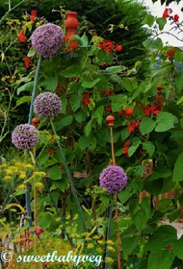Statuesque and sculptural they unfurled their millions of miniature florets at a graceful, patient speed. Why hurry? They had all the time in the world to flower, shedding their papery, protective cases like little flower fairies removing their hats. Giving them beans for company and bamboo canes with onion shaped terracotta finials; every stage of their growth was a wonder to behold.