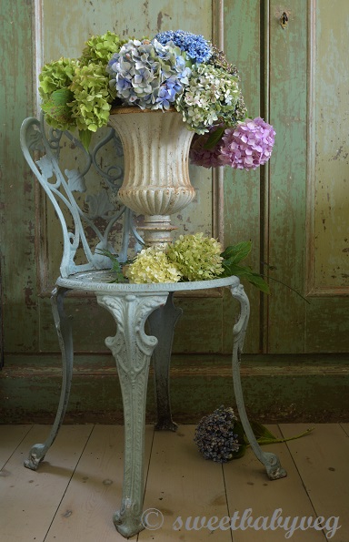 Their mopheads drooping and dipping as they grow heavy with rain, I gather these pastel shades of Hydrangeas and bring them indoors. As if the colour has washed from one petal to another, I lose myself in their water-colour tones and set about preserving them, by letting them dry naturally in an inch or so of water, so that their gentle beauty and grace can go on and on…..