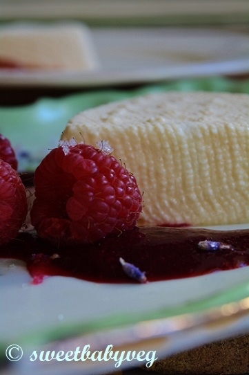 The mixture is set in little white porcelain heart shaped moulds which are lovingly lined with cheesecloth or fine muslin. Each heart, so pale, so gently set and textured by the weave of the cloth, turns out to make a heavenly yet simple dessert. Perfect when served with Apricot confiture or fresh berries sprinkled with Lavender sugar.