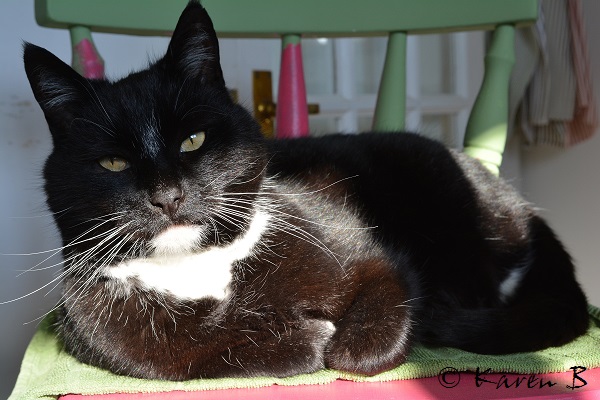 All is calm and gentle as we check out the weather forecast, the sunbeams spilling in through the window, the birdies on the sill. And all is fine and dandy, that is, until one of us wants to sit down, and then the fun and games begin.  Josef jumps up on the only stool to clean his whiskers, just seconds before I decide to sit down to eat. I carry in another stool, which he jumps on as well. I bring in a chair and yes, you’ve guessed, he jumps on that too. Then the minute I do manage to sit down on any seat he has vacated he jumps on my knee and I can’t reach my breakfast! This loving musical chairs ritual always ends up the same way. When the music stops, I eat my breakfast standing up, whilst Josef, full of pâté, luxuriates in the warmth of the sun as he rests on the stool. And I realise that when it comes to negotiating with this special, rough, tough playboy of a cat with his magnificent whiskers and sparkling white tuxedo, that I am as soft as melting butter in his warm, pink-padded paws. Meow!