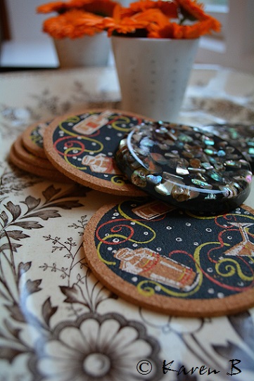 6. This dear Karen, your Halloween night, looks as if it was a total hoot. There’s a good chance I’ll be lurking around the windows next year “just in case” there’s another gathering. Plus place-mats in rip-off pad form – how fabulous – I can only dream of a such a thing! (Today I discovered you aren’t having a hiatus from blogging – for some reason my subscription to your blog was no more. 😖 Goodness knows what happened there. Thankfully this is now rectified and I’m slowly catching up on your life one more… phew!)