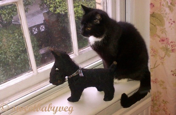 Animals make sweet, enduring and sometimes surprising choices when it comes to the friends they choose to hang out with. Here, I capture a phone snapshot of Josef, one of my cats, on a rainy Dartmoor day with his pal, the vintage toy Scottie Dog.